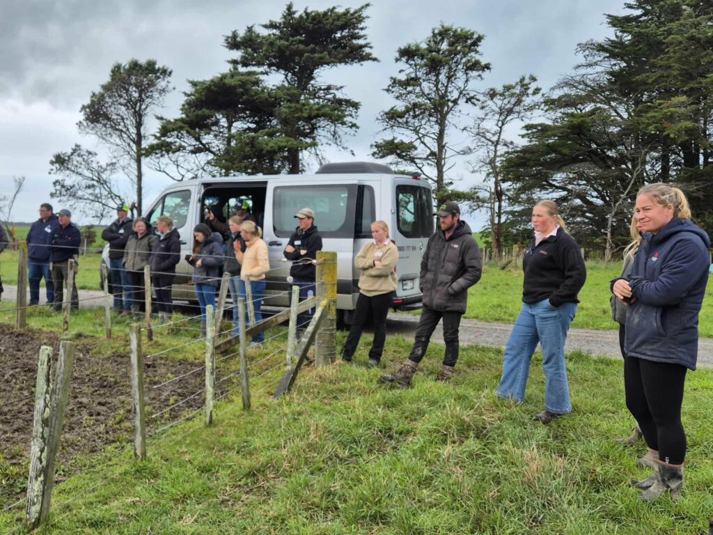 The first tour was to Matariki Terraces, on the Wairarapa Coast. Hosted by George and Sarah Tatham, Matariki Terraces is a diversified sheep, beef, and cropping enterprise. A fifth-generation farmer, George brings deep industry insight as a former Beef + Lamb New Zealand director, while Sarah contributes her knowledge as a local district nurse. The visit focused on aligning feeding strategies and genetics to optimise profitability, with detailed discussions around breeding objectives and bull selection.